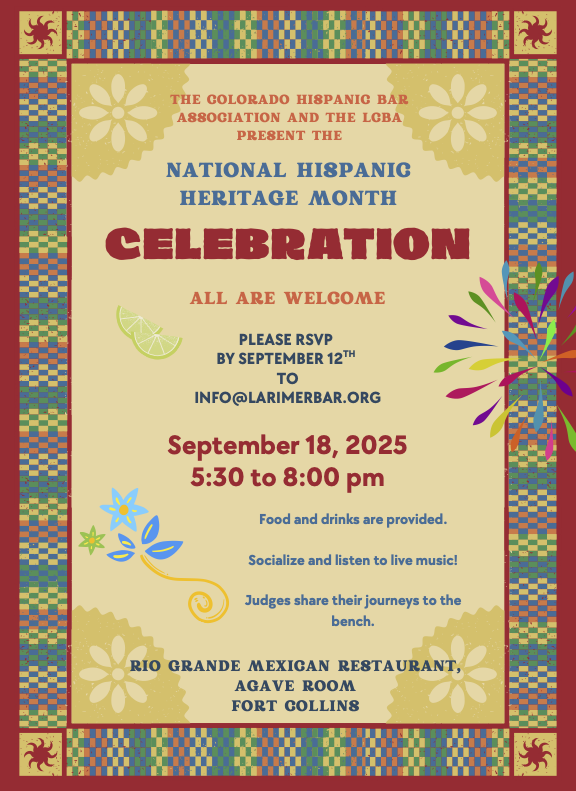 The Colorado Hispanic Bar Association and LCBA invite you to celebrate National Hispanic Heritage Month with food, drinks, live music, and inspiring stories from judges.